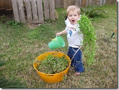Tate was snuggly in the sling. He typically takes a nap in the sling every afternoon as it’s difficult to get him down for a late afternoon nap when Rush is bouncing off the walls. We’re gradually working on beautifying the desolate stretches of fence (pictured below) in our yard.